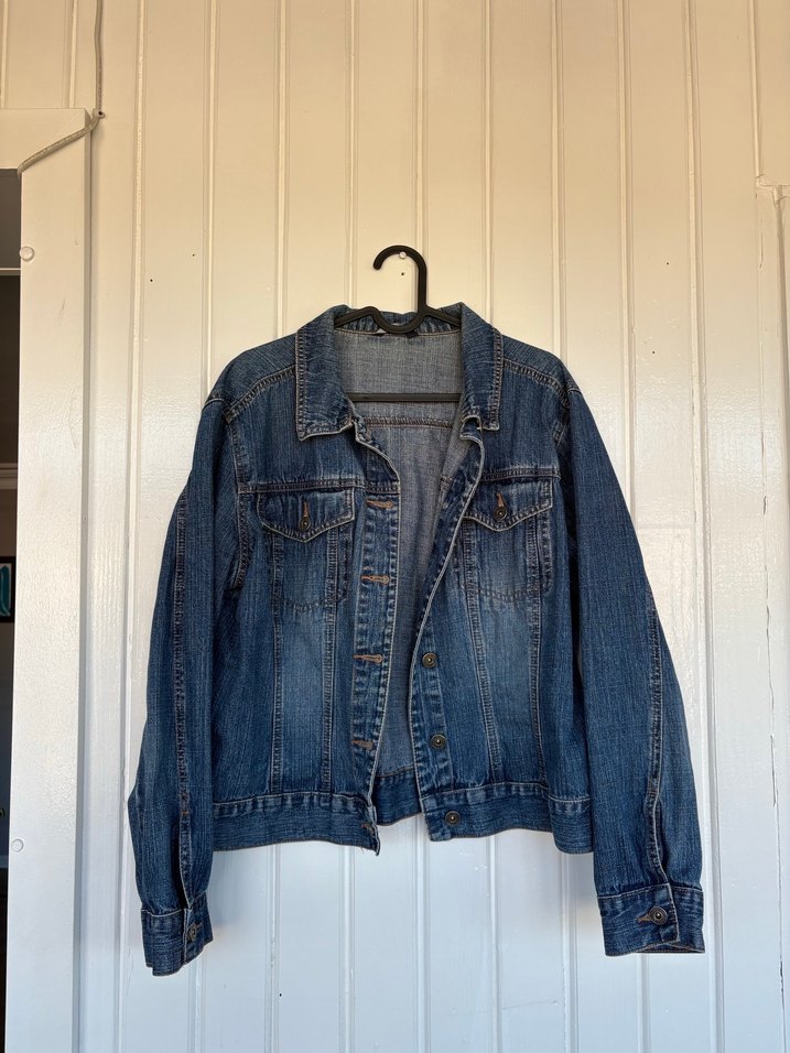 Kadınlar için mavi denim ceket, düğmeli ön ve cepli. Uzun kollu, gevşek kesim ve notlu yaka detayına sahip, günlük kullanıma uygun.