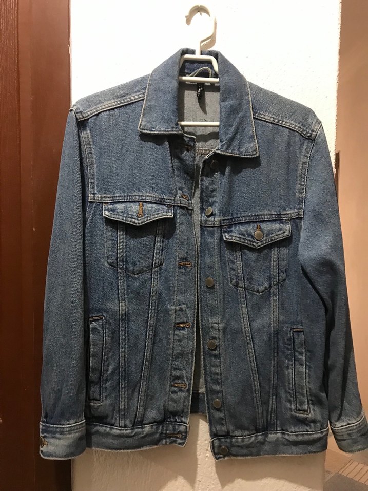 Bu kadın mavi denim ceket, rahat kesim ve düğmeli kapamaya sahiptir. Uzun kollu ve kesimli yakalıdır, günlük sokak stili için uygundur.