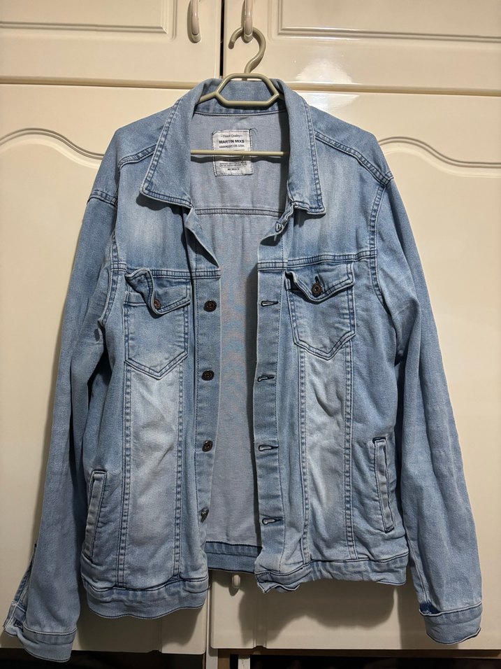 mavi renkli denim ceket, düğmeli ve salaş kesimlidir. Notlu yaka ve uzun kolludur, günlük sokak stiline uygundur.