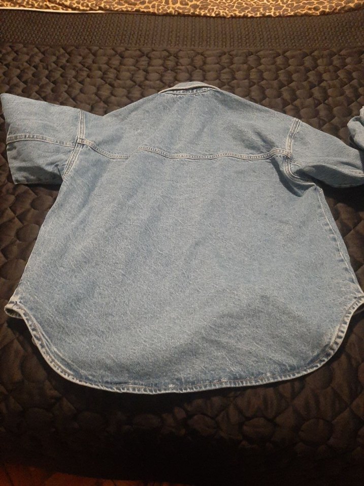Salaş kesim, düğmeli kadın denim ceket. Uzun kollu ve yuvarlak yakalı, günlük ve sokak stiline uygun. Orta uzunlukta, sade mavi renkte.