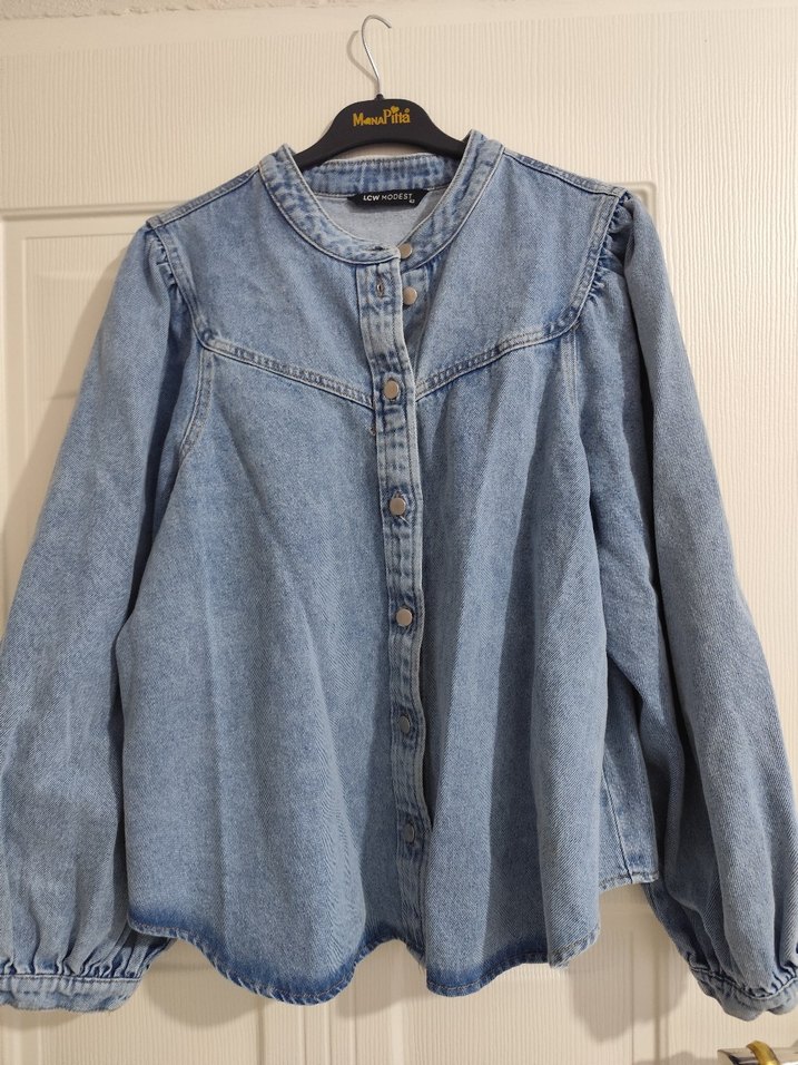 Açık mavi denimden, bol kesim ve düğmeli önü olan ceket. Uzun, lastikli kollu ve yuvarlak yakalı, günlük sokak stiline uygun.Ürün bir kere tek giyildi kalıbı dar boy 158 kg 56