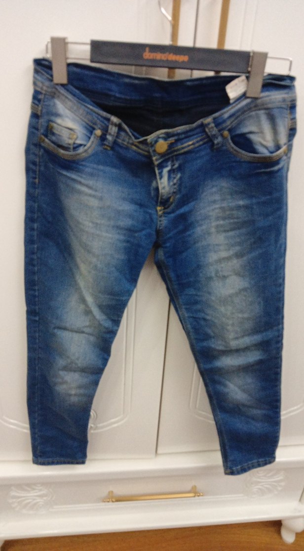 Parlak görünümlü, tokalı ve dar kesim mavi denim kot pantolon. Günlük rahat sokak stili için midi boy ve desensiz tasarım.