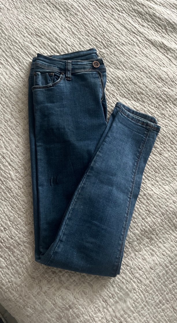 Kadınlar için mavi denimden yapılmış, dar kesim ve normal boyda pantolon. Sade ve desen içermeyen tasarımıyla günlük kullanıma uygundur.