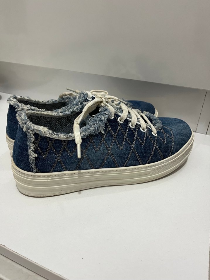 Mavi denim malzemeden, bağcık detaylı ve bilek çevresinde fırfır süslemeli kadın spor ayakkabısı.Ürün bir veya iki defa kullanıldı.38 numara.Pazarlık payı vardır.Orjinaldir