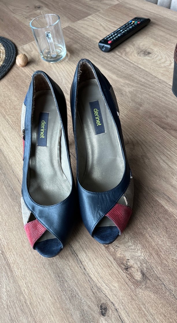 Kadınlar için mavi denim malzemeden, tokalı dolgu topuklu stiletto. Paris tarzı, romantik akşamlar için şık ve çağdaş bir model.Bir iki kez giyildi çok yüksek olduğu için giyilemiyor.