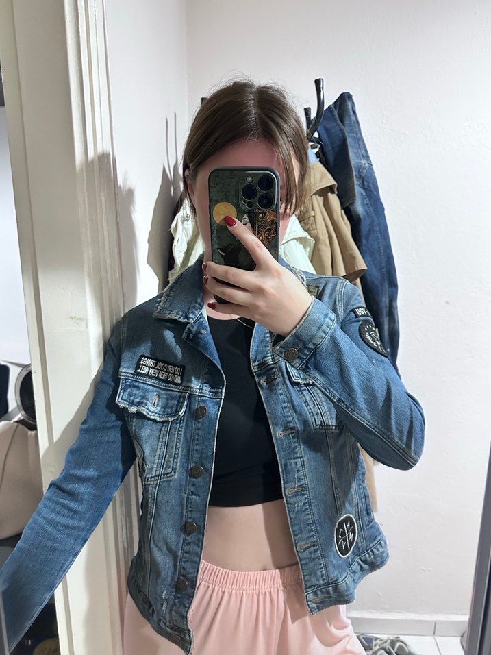 Mavi Marka Desenli Kot Ceket. Ürünün bir defosu yoktur ayrıntılarını fotoğraflarda ekledim.