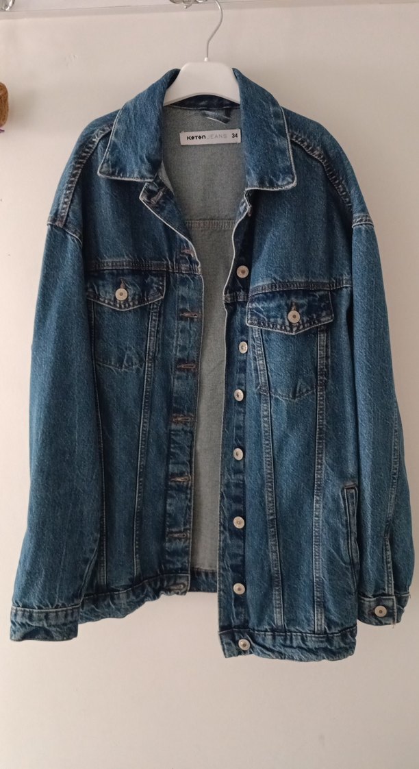 Düğmeli, uzun kollu, yakalı ve bol kesim kadın mavi denim ceket, günlük rahat kullanım için uygundur.