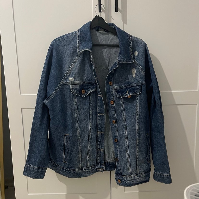 Düğmeli, uzun kollu, bol kesim mavi denim ceket. Casual sokak stili için yakası kesik, günlük kullanım için uygun.