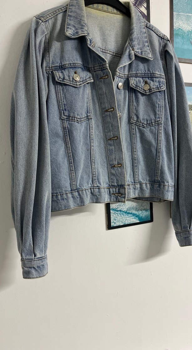 Bol kesim mavi denim ceket, düğmeli ve yakası kesik. Uzun kollu ve normal boyda, günlük kullanıma uygun. Rahat sokak stili.