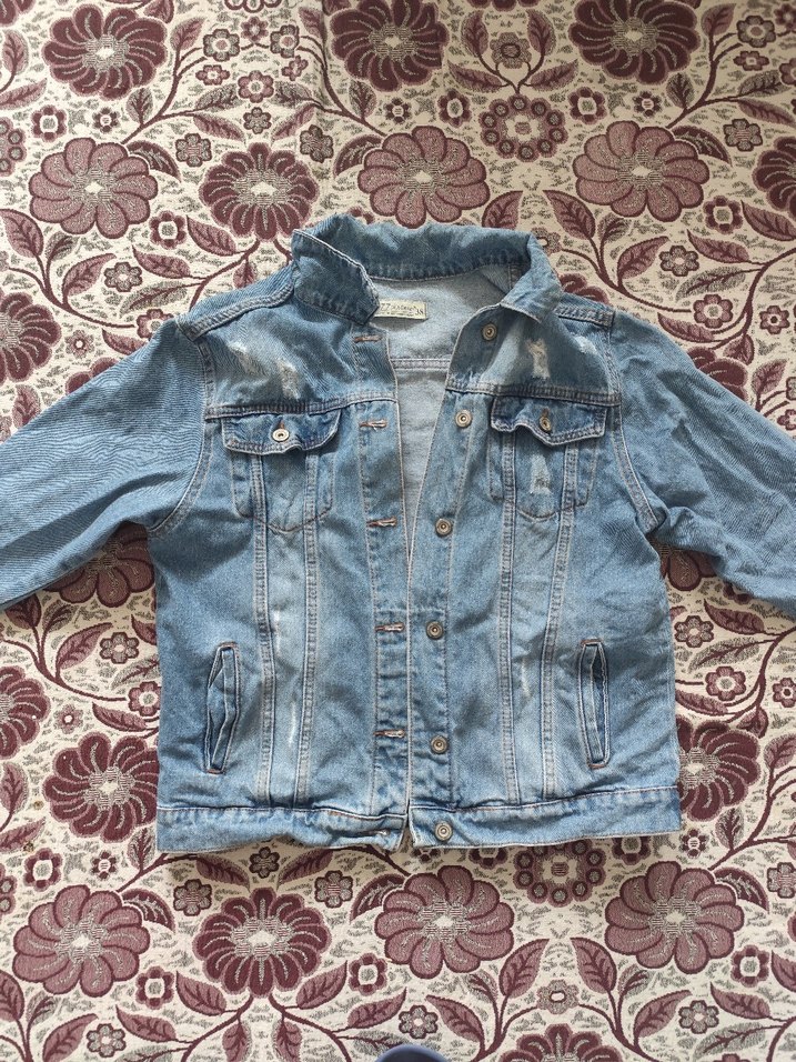 Düğmeli, yakalı ve uzun kollu bol kesim kadın mavi denim ceket. Mavi tonlarda batik desen içerir, günlük sokak stili için uygundur.