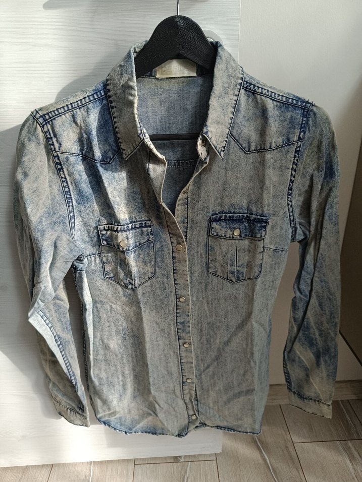 Gri renkli, düğmeli, uzun kollu, yakalı ve cep detaylı denim gömlek. kumaşı çok rahat az kullanıldı deformesi yok