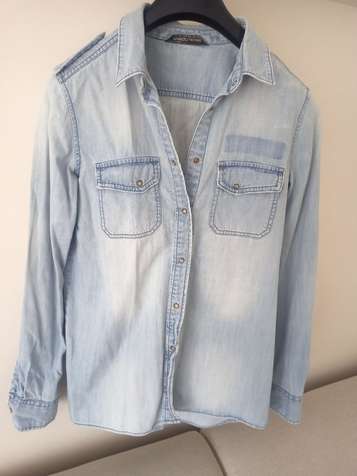 Kadınlar için düğmeli, uzun kollu, yakalı mavi denim gömlek. İki göğüs cebi ve rahat kesimiyle günlük sokak stili için uygundur.