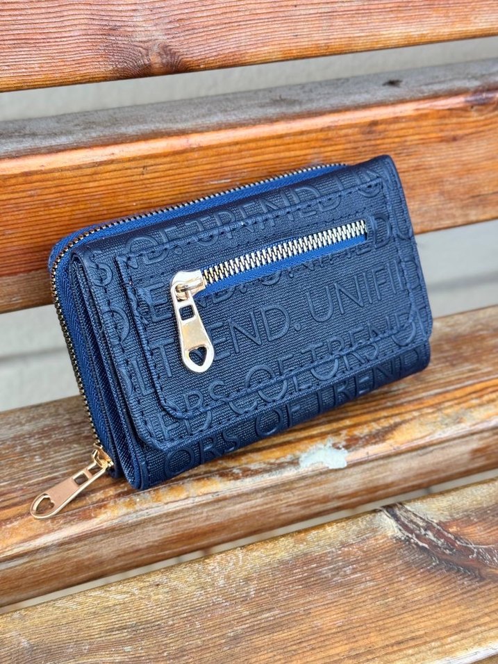 Kadınlar için fermuarlı, parlak mavi denimden yapılmış ve nakış desenli cüzdan. Sokak modasını yansıtan, gündelik kullanıma uygun şık tasarım.
