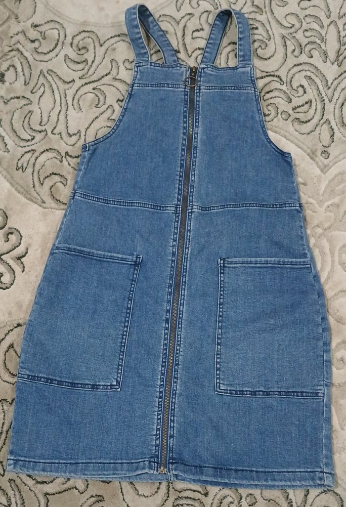 Fermuarlı, askısız kesim ve büyük ceplere sahip, fitted mavi denim midi salopet. Günlük sokak stiline uygun.
