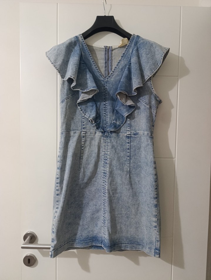 Kolsuz, V yaka, fırfır detaylı mavi ve gri tonlarda batik desenli, vücuda oturan denim elbise. Günlük sokak stili için uygun. 42 beden yazıyor ama ölçülere göre daha küçük bedene uygun bakarak alin.iki koltuk altı arası 45 bel 40 boy 83