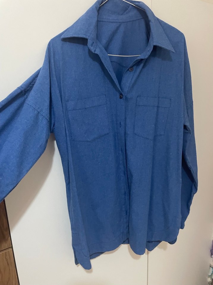 Mavi denimden, düğmeli, uzun kollu, bol kesim ve yakalı kadın gömleği. İki ön cepli, günlük rahat kullanım için uygundur. Hiç giymedim etiketi yok