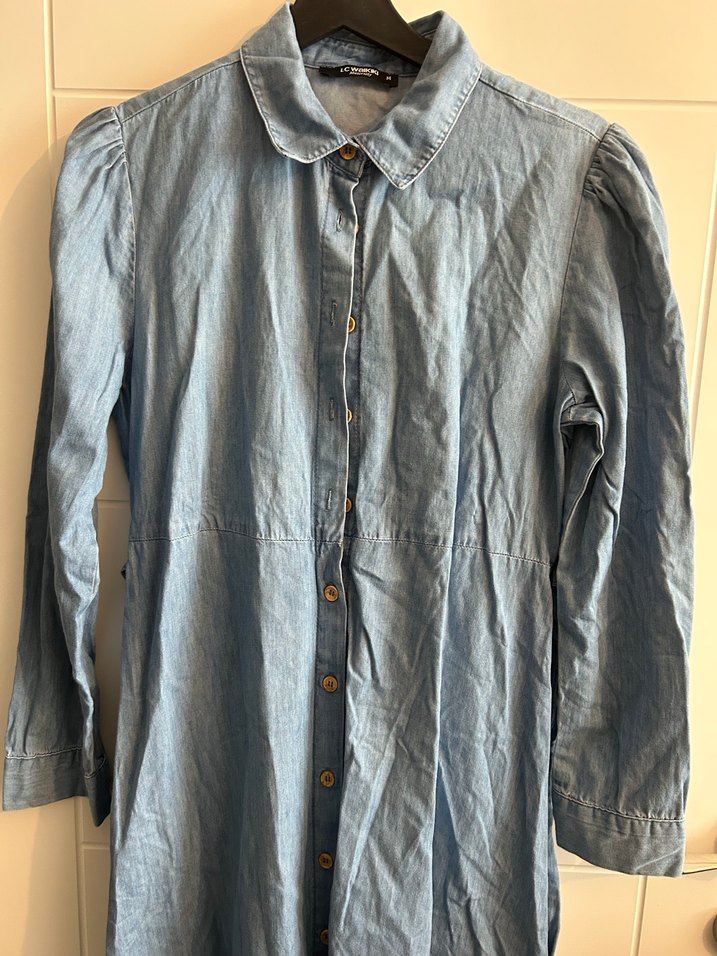 Kadınlar için mavi denim gömlek elbise, yakalı, uzun kollu ve bol kesimdir. Düğmeli kapanışı ve günlük sokak stiliyle kullanıma uygundur.