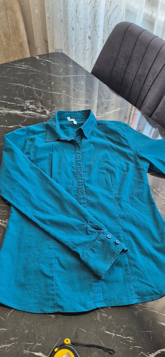 Uzun kollu, düğmeli, yakalı mavi denim gömlek. Normal kesim ve parlak renkte, günlük veya ofis kullanımı için uygun.