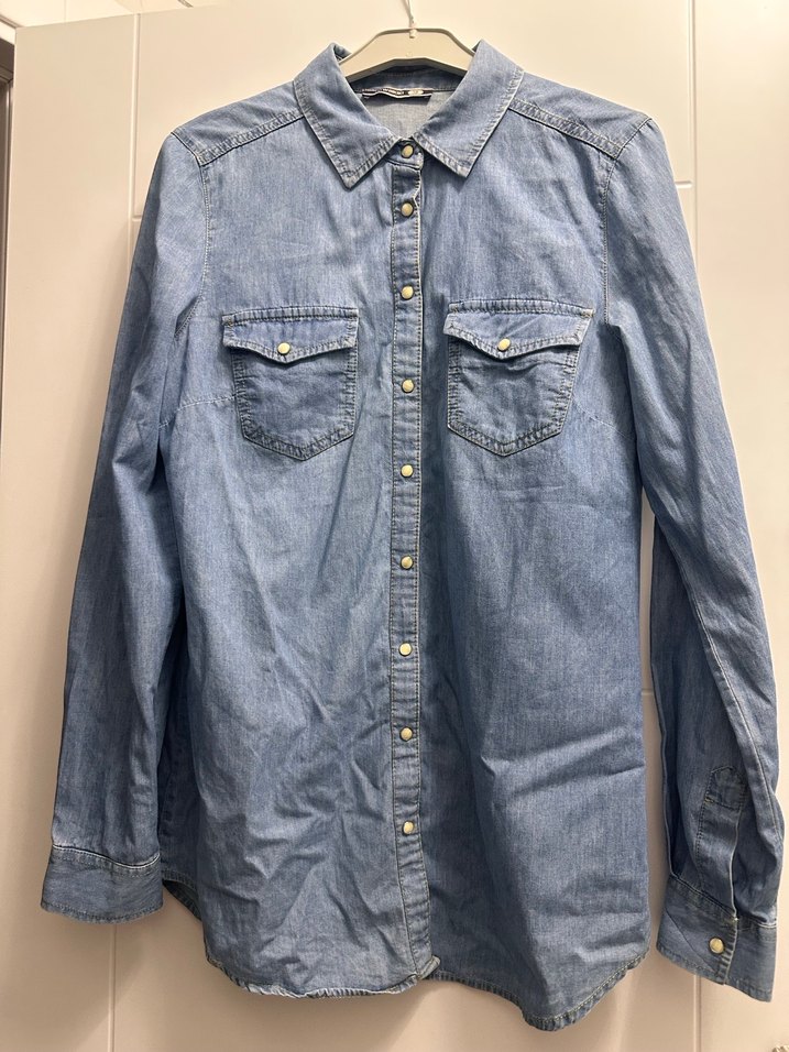 Bu mavi denim gömlek, yakalı ve düğmeli tasarıma sahiptir. Uzun kollu ve bol kesimdir, günlük sokak stiline uygundur. Kumaşı parlak görünümlüdür ve midi boydadır.
