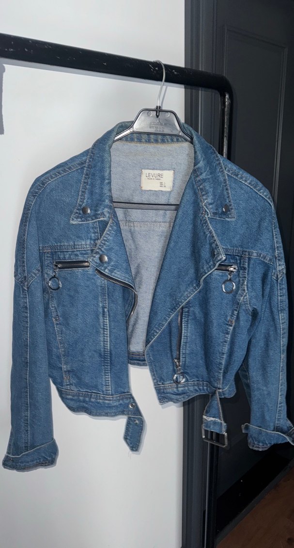 Kemerli, kesimli mavi denim ceket, notlu yakalı ve askılı kollu. Günlük kullanıma uygun, sokak stilinde şık bir parça.