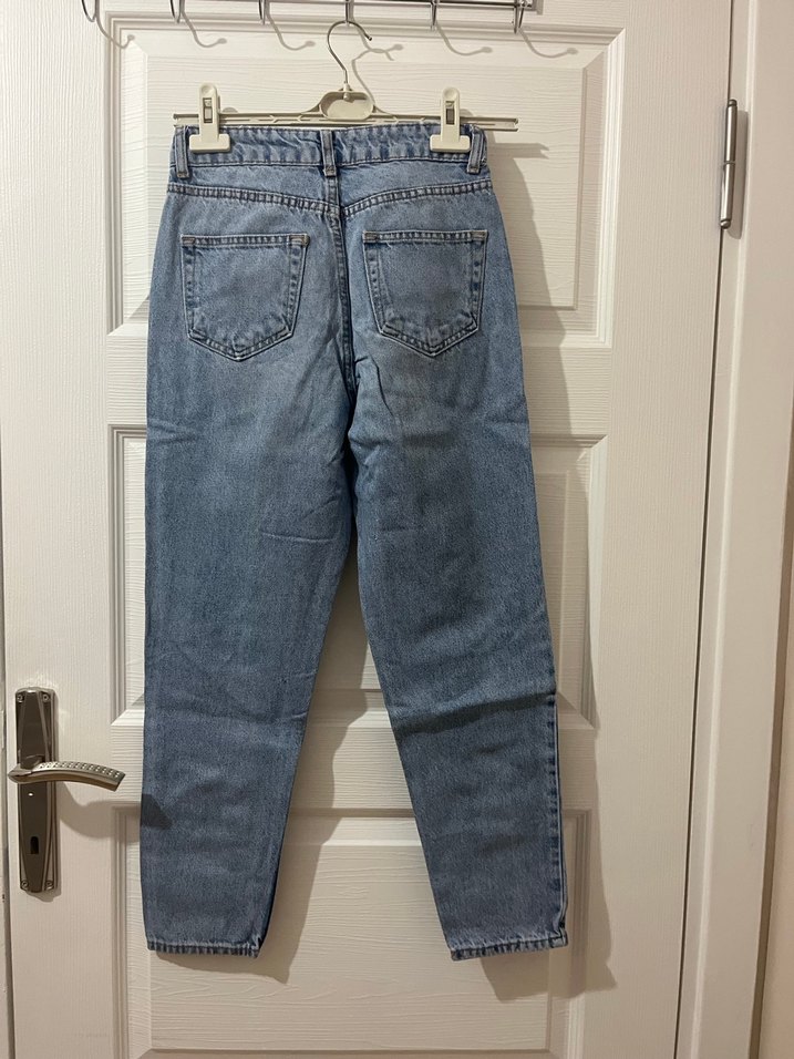 Gri tonlarında mavi denim kumaştan, kemerli ve normal boyda, rahat kesim kadın jean pantolon.