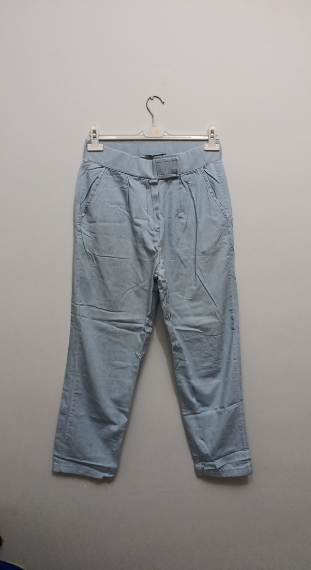 Kadınlar için mavi denim kumaştan, kemerli bel ve bol kesime sahip, normal midi boyda, sokak stilinde pantolon. İşlem gördü.