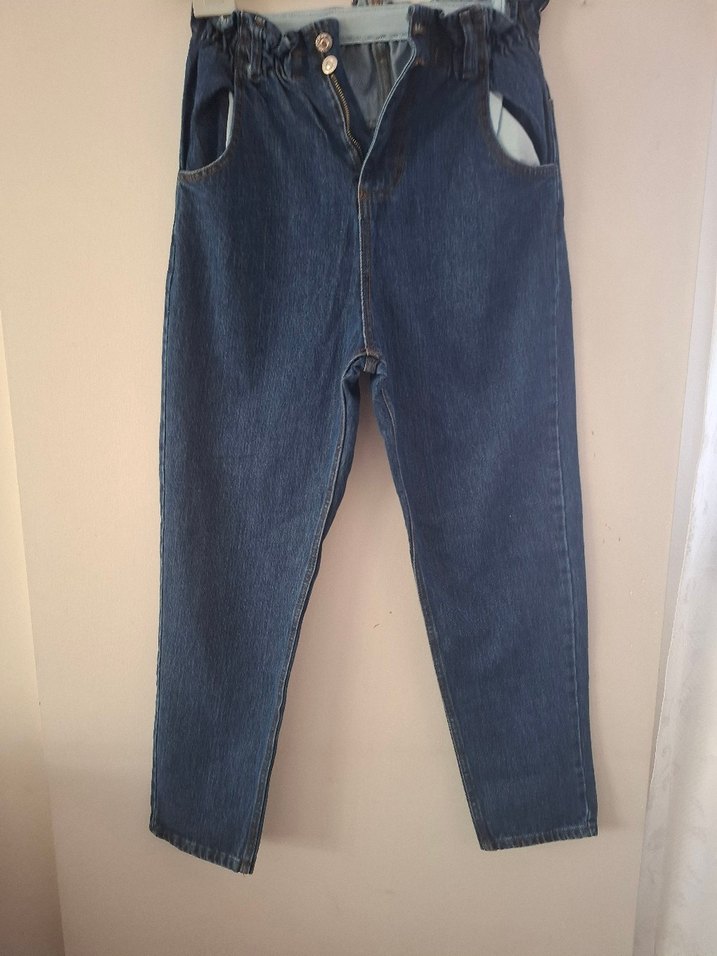Kadınlar için kemerli, bol kesim mavi denim jean. Midi boyda, desen içermeyen, günlük kullanıma uygun rahat sokak stili jeans.