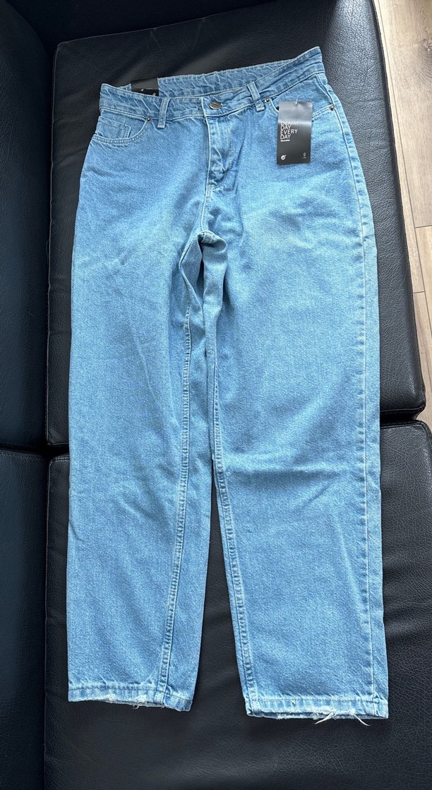 Kadınlar için mavi denim, regular fit ve kemerli bel detaylı pantolon. Günlük kullanım için uygun.