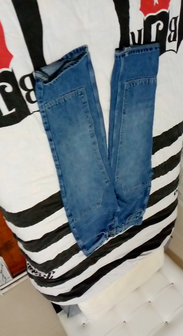 Kadın mavi denim kumaştan, kemerli ve vücuda oturan normal boy pantolon. Günlük kullanım için uygun, desen içermeyen rahat bir tasarıma sahiptir.