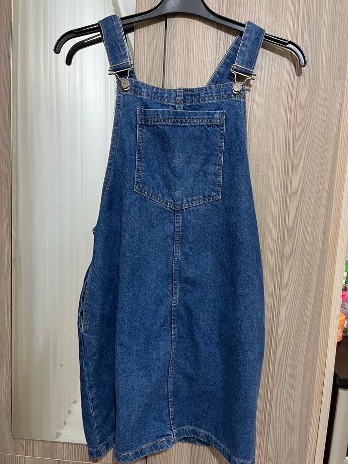 Mavi denim kumaştan, askılı ve tokalı, dar kesim kadın kısa salopet. Desensiz, sokak tarzına uygun rahat bir model.