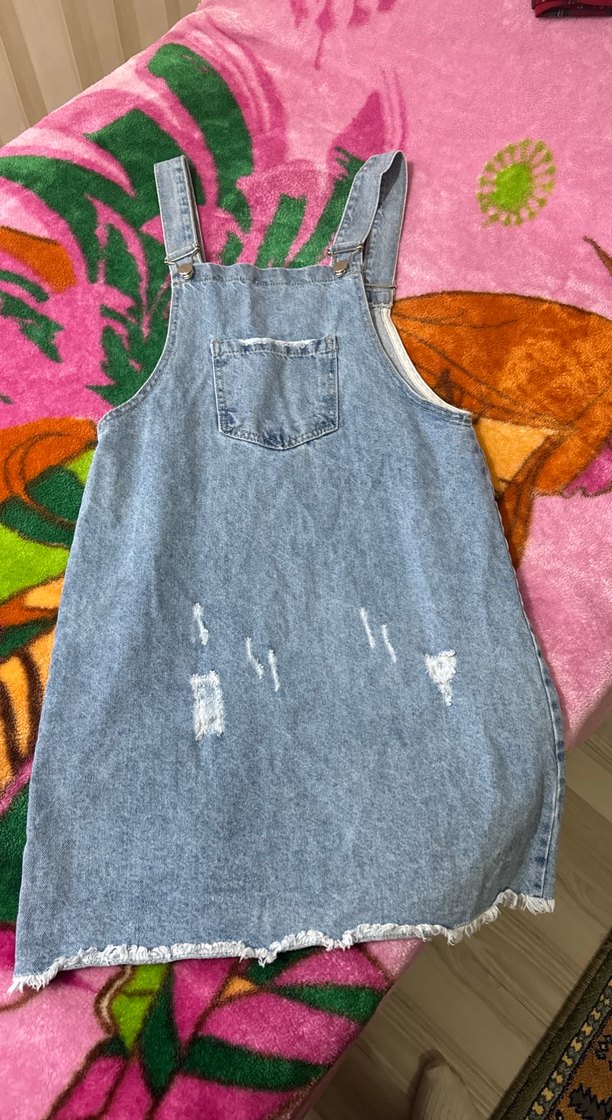 Ön cep ve tokalı askıları olan bol kesim mavi denim kısa salopet. Günlük kullanıma uygun, rahat sokak stili.
