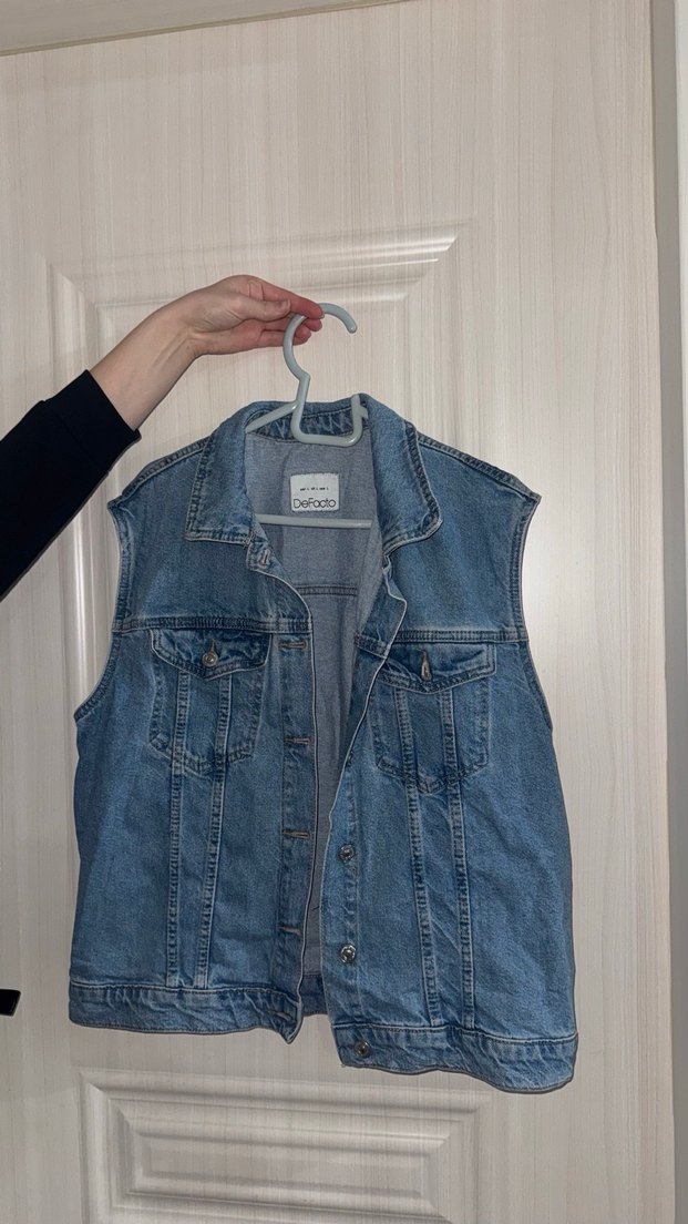 Kadınlar için mavi denim kolsuz ceket, çıtçıt düğmeli ve kesik yakalıdır. Rahat ve bol kesimiyle günlük sokak stiline uygundur.