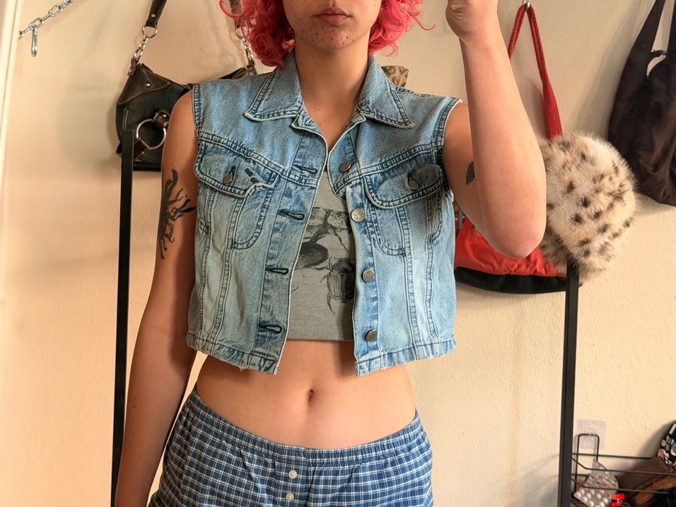 Kadınlar için mavi renkli, düğmeli ve kolsuz, vücuda oturan denim yelek. Günlük kullanıma uygun, grunge punk tarzı yansıtan bağlama desenli model.