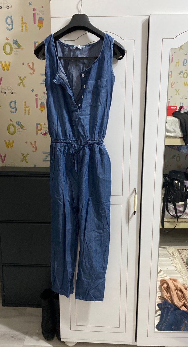Kolsuz, V yaka, kemerli, midi uzunlukta mavi denim tulum. Rahat ve şık, gündelik kullanım için uygundur.