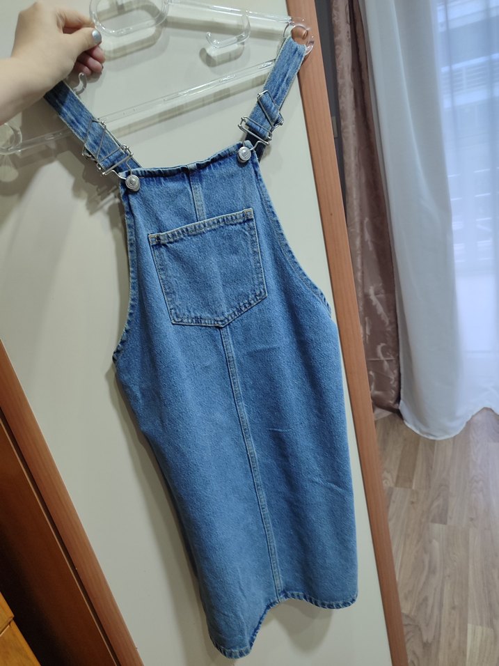 Askılı, tokalı ve cep detaylı mavi denim midi tulum. rahat, günlük sokak stili için uygun.