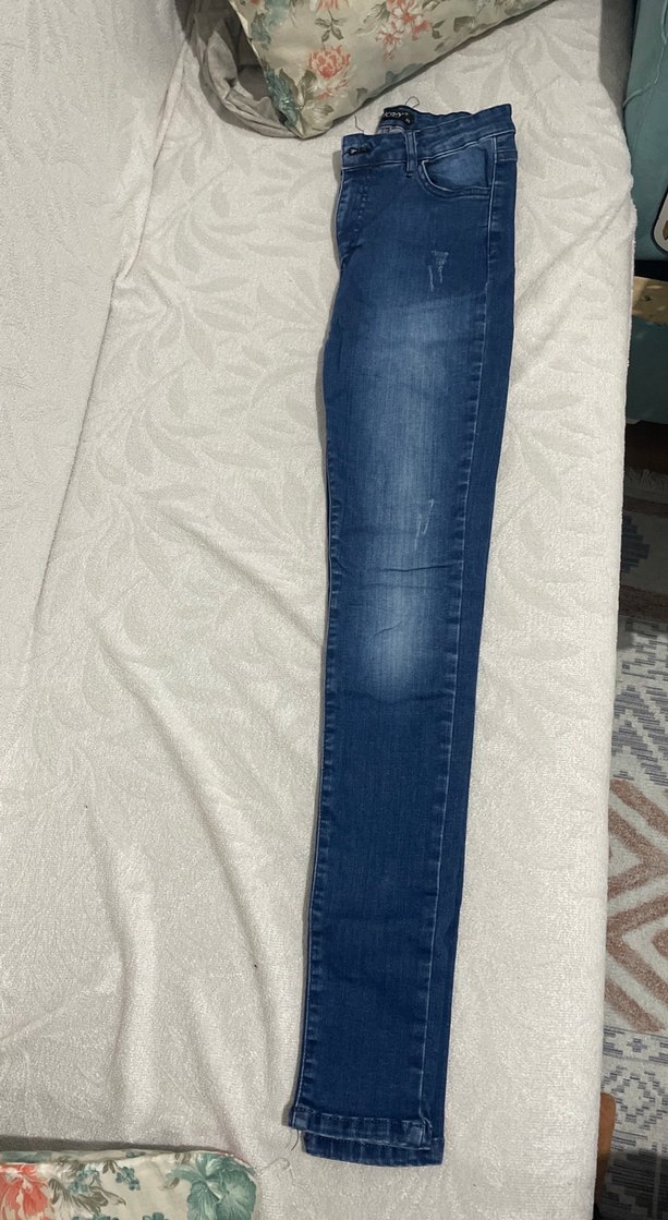 Kadınlar için mavi denimden, midi boyda, dar kesim jean. Normcore tarzında, günlük kullanıma uygun yırtmaç detaylı jean.