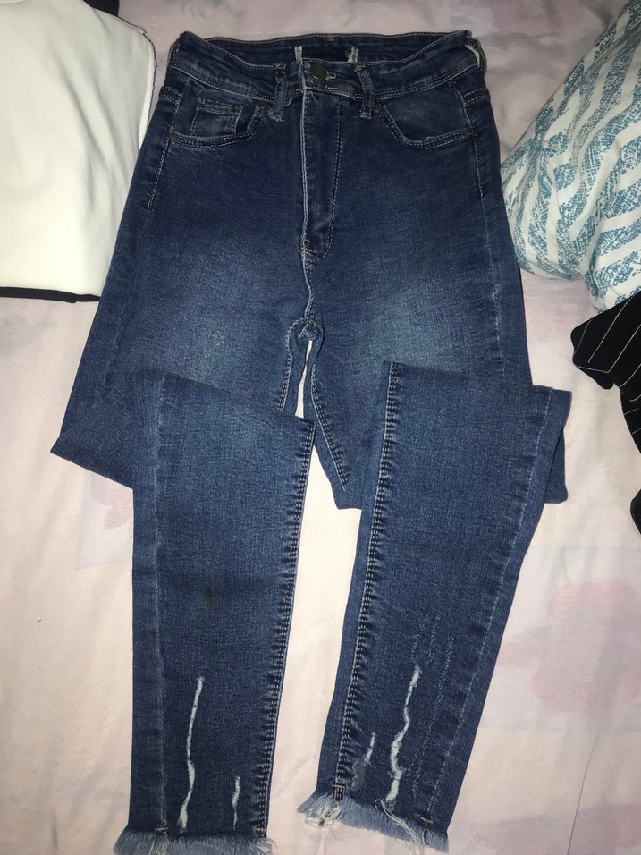 Kadınlar için mavi denim dar kesim midi boy kot pantolonlar, tokalı detaylara sahip. Sokak tarzı ve günlük kullanıma uygun, hafif soluk ve püsküllü etek uçları bulunur.
