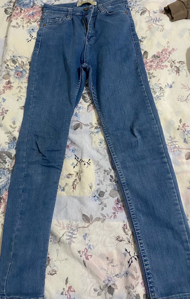 Pastel mavi tonlarında, bağlamalı detaylı, dar kesim midi boy kadın denim jean, günlük sokak stiline uygun.