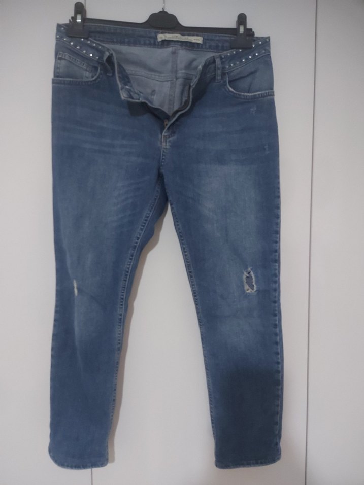 Kadınlar için mavi denim kot pantolon, regular fit ve midi boy. Tokalı detaylar ve hafif yıpranmış görünümle sokak stili sunar. Günlük kullanıma uygun.