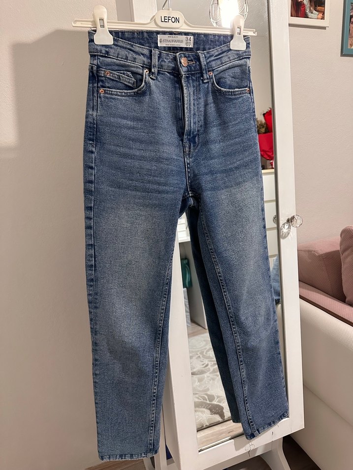 Mavi denimden yapılmış, rahat kesim ve midi boyda, tokalı detaylı kadın pantolon. Günlük kullanıma uygun, baskılı deseni ve "LEFO" markası bulunur.