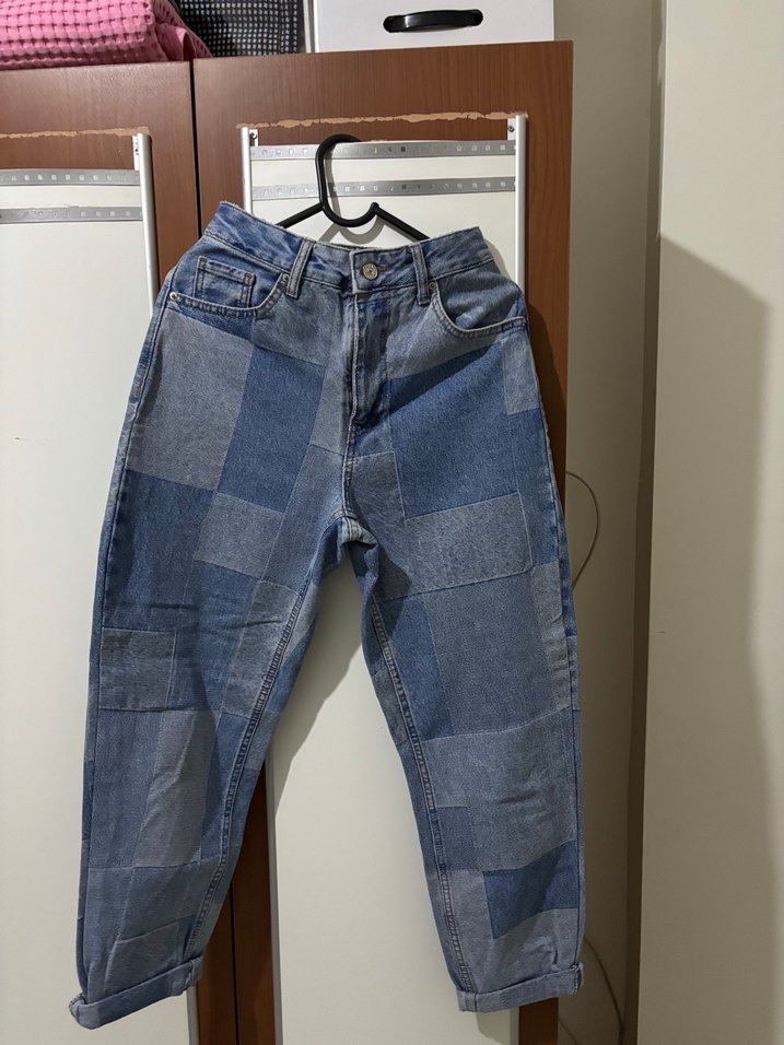 Mavi denimden yapılmış, regular fit ve midi boy kot pantolon. Tokalı detayı ve parça desenleriyle trend bir sokak stili sunar. Günlük kullanıma uygundur.