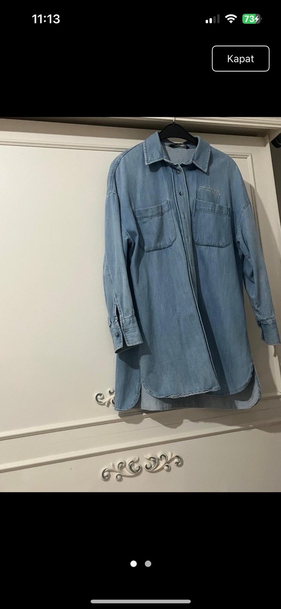 Mavi renkte, düğmeli, uzun kollu, yakalı, bol kesim denim midi ceket. Günlük kullanım için uygun, rahat sokak stili.