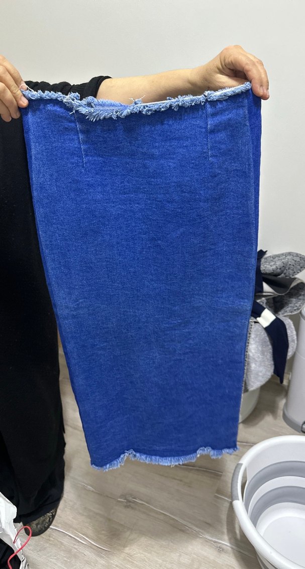 Bu fitted mavi denim midi etek, yıpranmış kenar detayına sahip olup, günlük kullanım için rahat ve şık bir görünüm sunar.