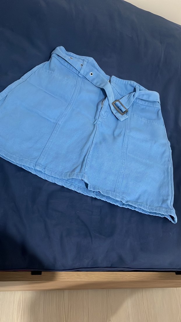 Kadınlar için bel kemerli, bol kesim mavi denim midi etek. Pastel tonlarda, desen içermeyen rahat sokak stiline uygun etek.