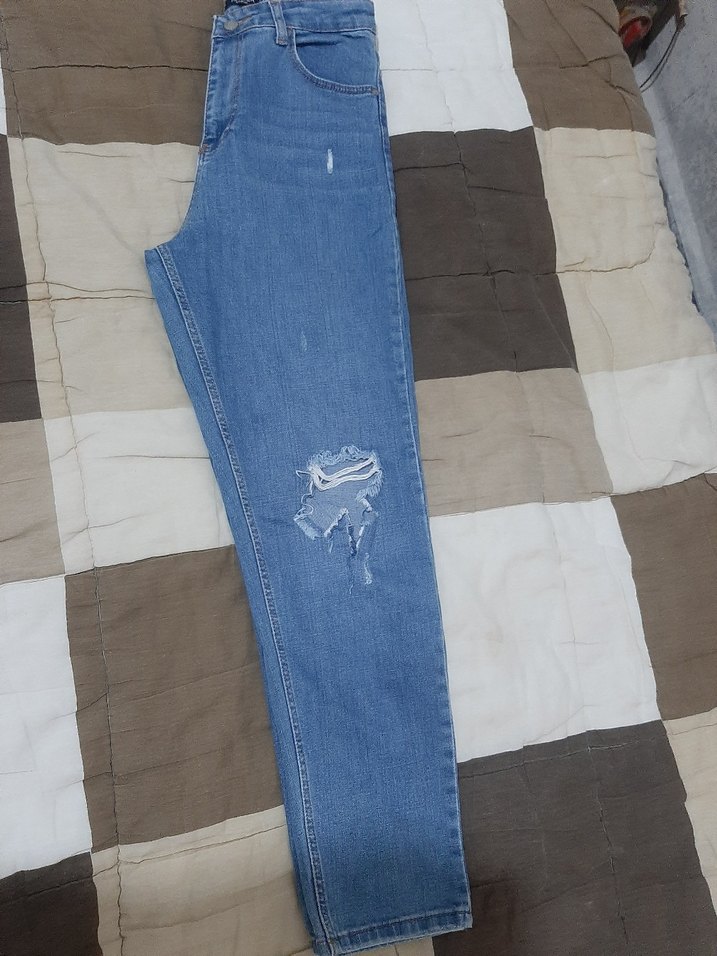 Kadınlar için mavi denim midi uzunlukta, regular fit kot pantolon. Yırtık detayları ve yırtmaçlı tasarımıyla günlük kullanıma uygun streetwear tarzı jeans