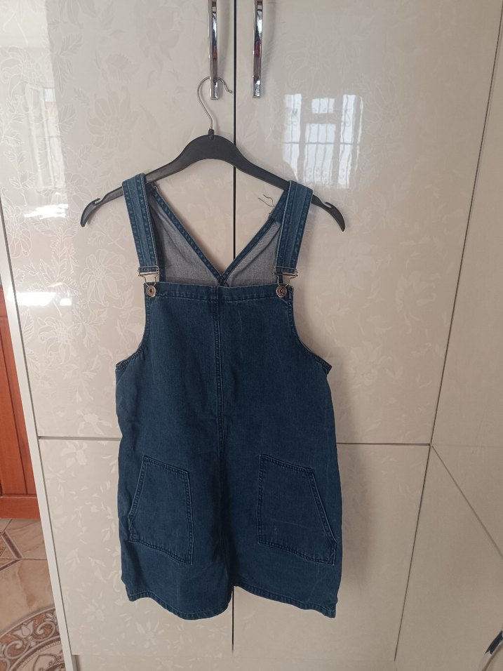 Mavi denim midi salopet, bol kesim ve askılı kayışlarda tokalı detaylarla. Kolsuz ve günlük rahat kullanıma uygun.