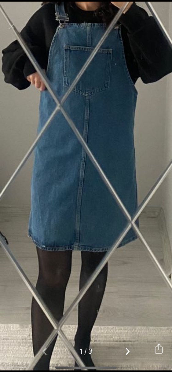 Mavi denimden yapılmış, tokalı askılı ve yüksek yakalı, vücuda oturan midi uzunluğunda kadın salopet. 54 kiloyum bedenini büyük aldım ki bir tık uzun dursun ama sweat tarzı şeylerle giyince tam oluyor