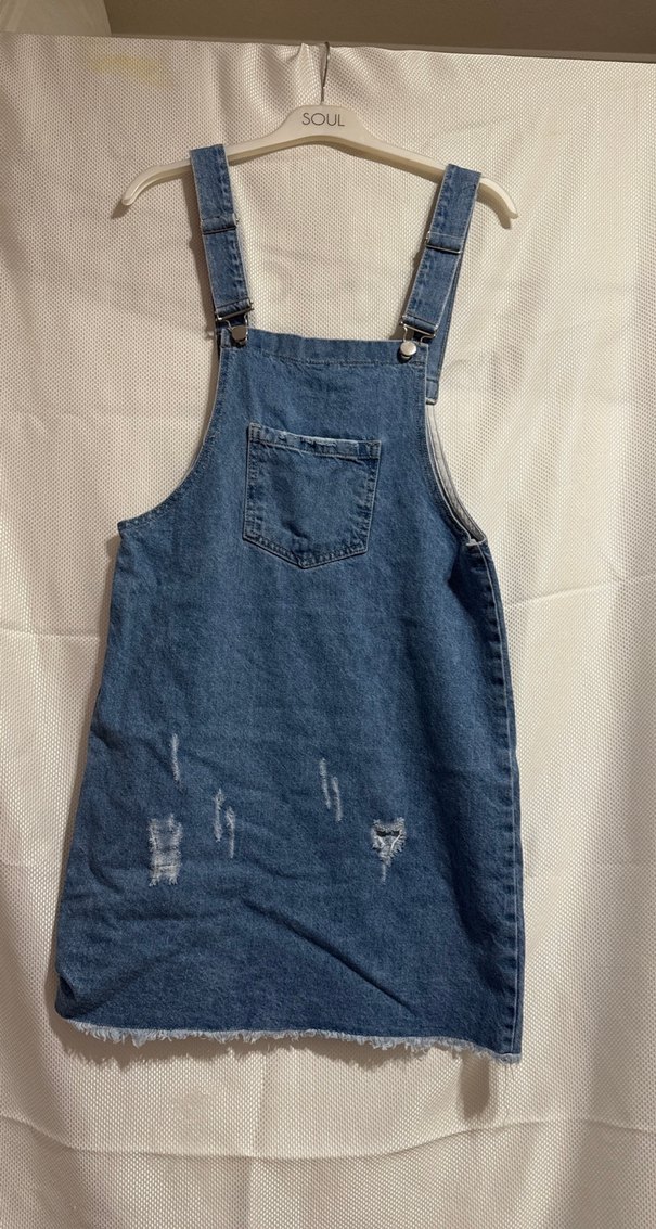 Mavi denim mini tulum, bol kesim ve yaka detaylı. Ayarlanabilir tokalı askılar ve ön cep bulunur, günlük sokak stili için uygun.