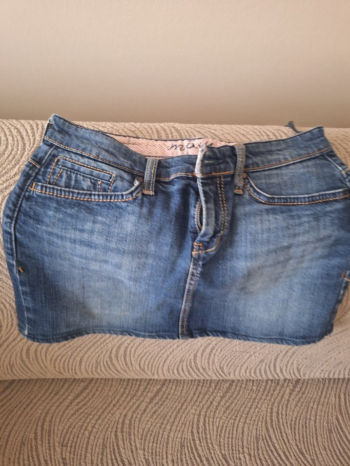 Bohem tarzda, tokalı ve fitted kesim mavi denim mini etek, günlük kullanım için uygun uzunlukta.