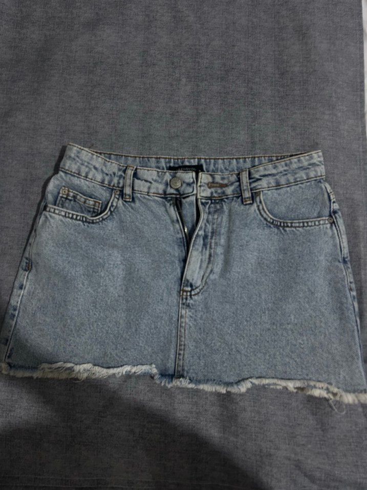 Mavi renkte, kesik kenarlı, kısa ve vücuda oturan denim mini etek, rahat sokak modası için uygun.